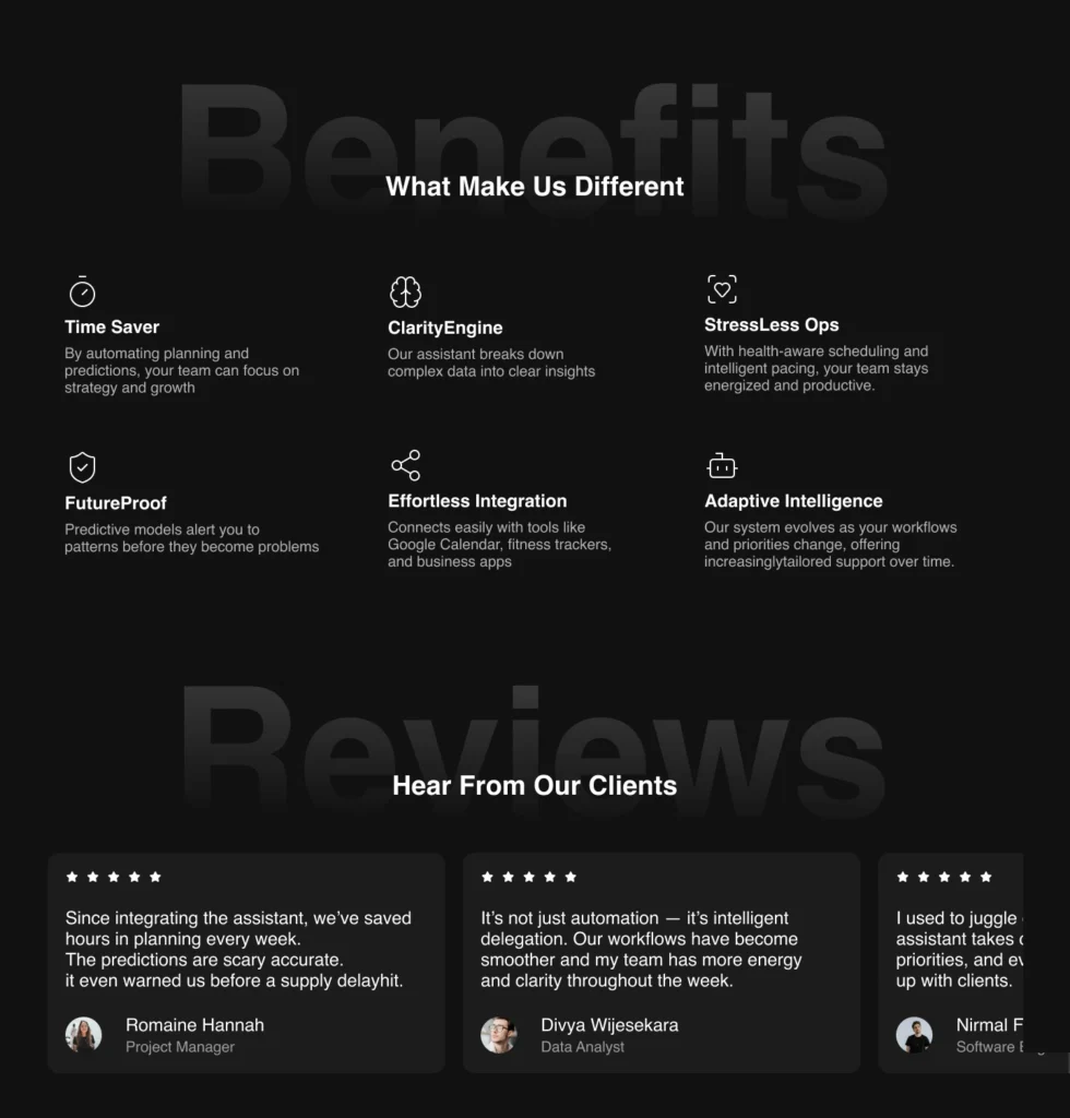 Testimonial Cards: The “Hear From Our Clients” section uses dark cards with stark white text to highlight specific wins, such as “saved hours in planning,” grounding the abstract AI concepts in real-world results.