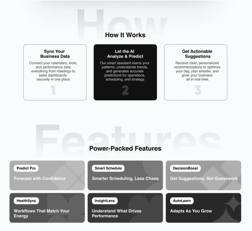 Transparency: The “How It Works” section simplifies the AI “black box” into three digestible steps: Sync -> Analyze -> Act, making the onboarding process feel less intimidating.