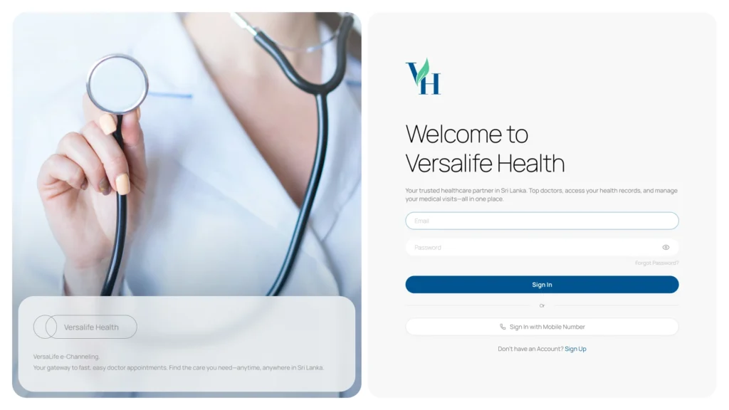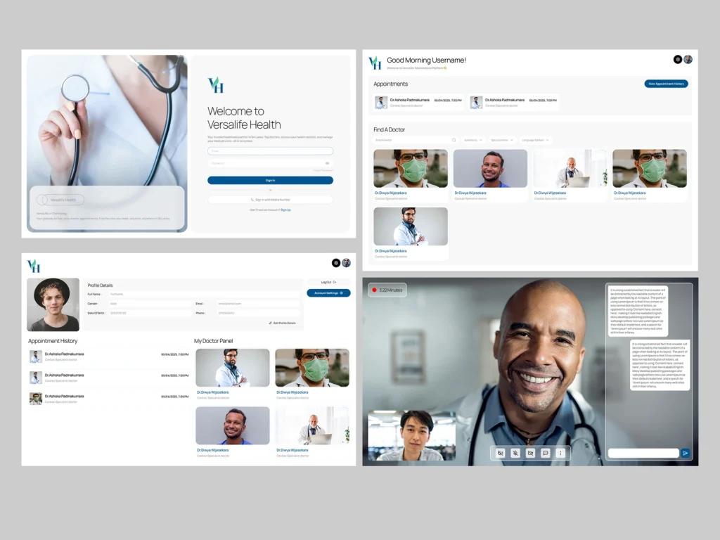 Versalife Health is a dual-sided digital health platform designed to simplify the medical appointment process in Sri Lanka. It serves as a centralized hub where patients can book appointments, manage prescriptions, and consult with doctors via video, while doctors can manage their practice and patient records.
