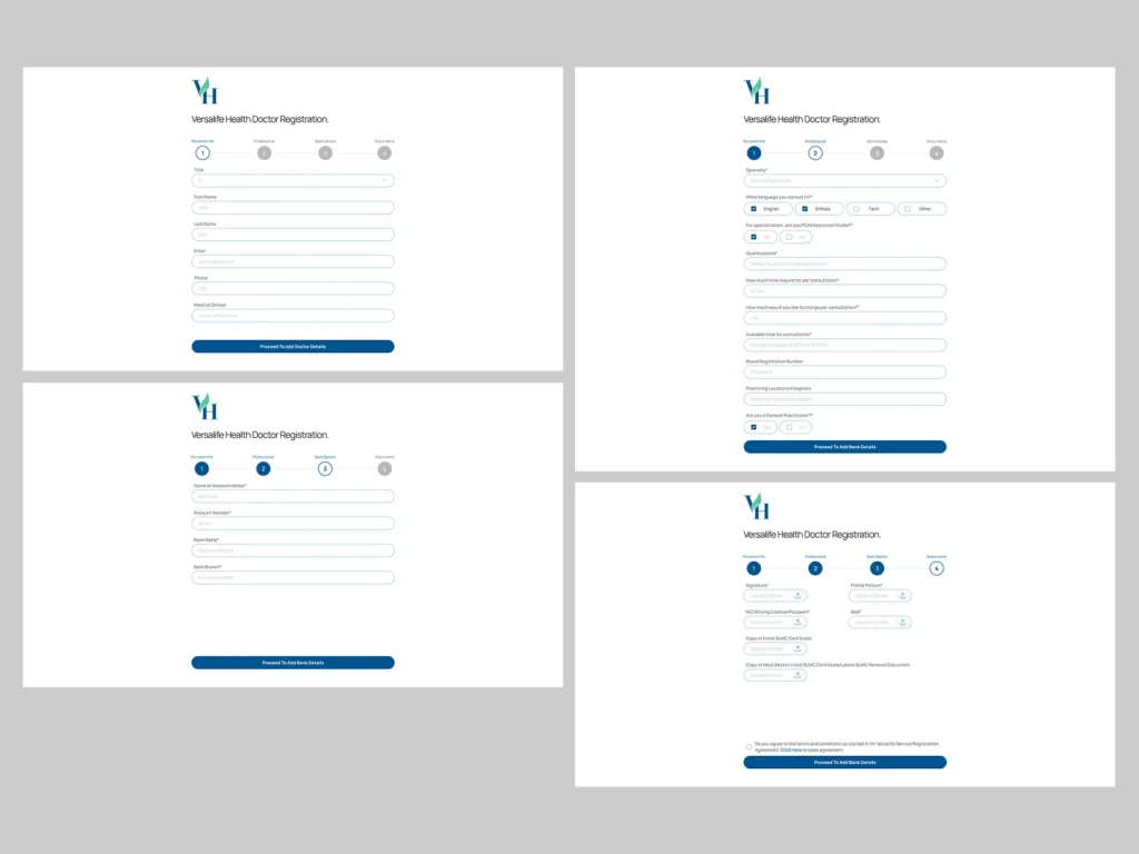 Recognizing that doctors are busy, I broke the registration process into 4 digestible steps: Personal Info, Professional, Bank Details, and Documents.